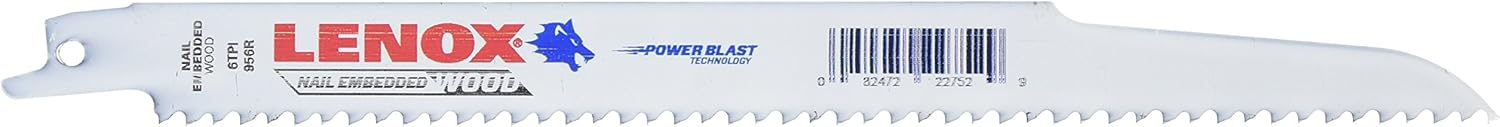 The Lenox 22752OSB956R is a bi-metal reciprocating saw blade engineered for aggressive cutting in wood and wood with embedded nails. Featuring Lenox POWER BLAST™ technology, the blade is reinforced along the cutting edge to reduce breakage and extend service life in demanding applications. Patented T2™ tooth design distributes cutting forces more evenly across the teeth, improving durability and cutting efficiency.